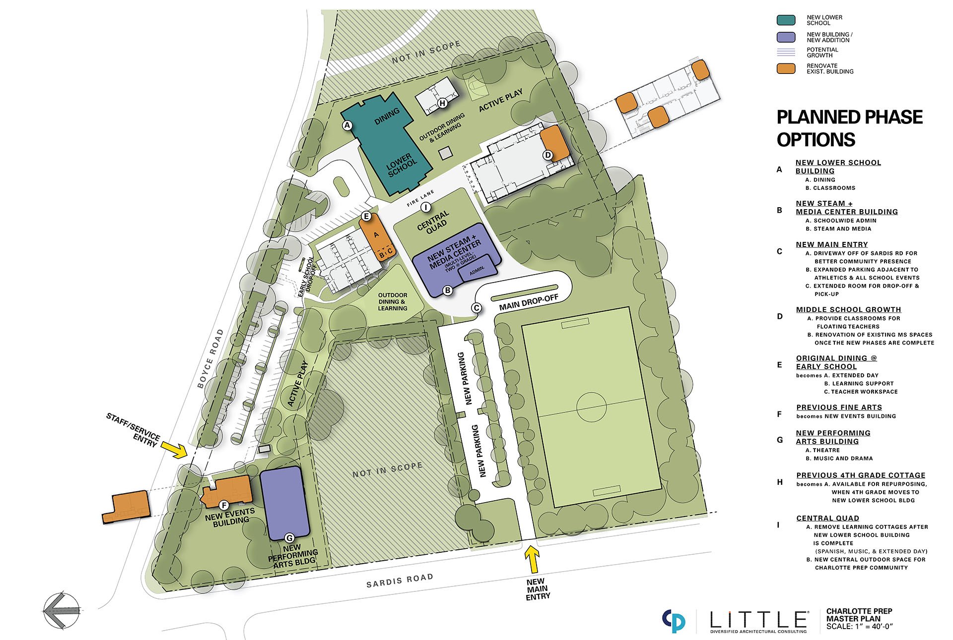 In 2022, Charlotte Prep began a comprehensive strategic planning process that engaged the entire community in a process of evaluating “where we have been and where we want to go.” As a part of the strategic planning process, a campus master plan was envisioned to identify the facility priorities for the campus. Key among the priorities was re-imagining classrooms to enhance student learning and differentiate Charlotte Prep. Developed through a thoughtful and deeply collaborative process, this phased master plan produced by Little Diversified Architectural Consulting will carry our school well into the future.
